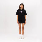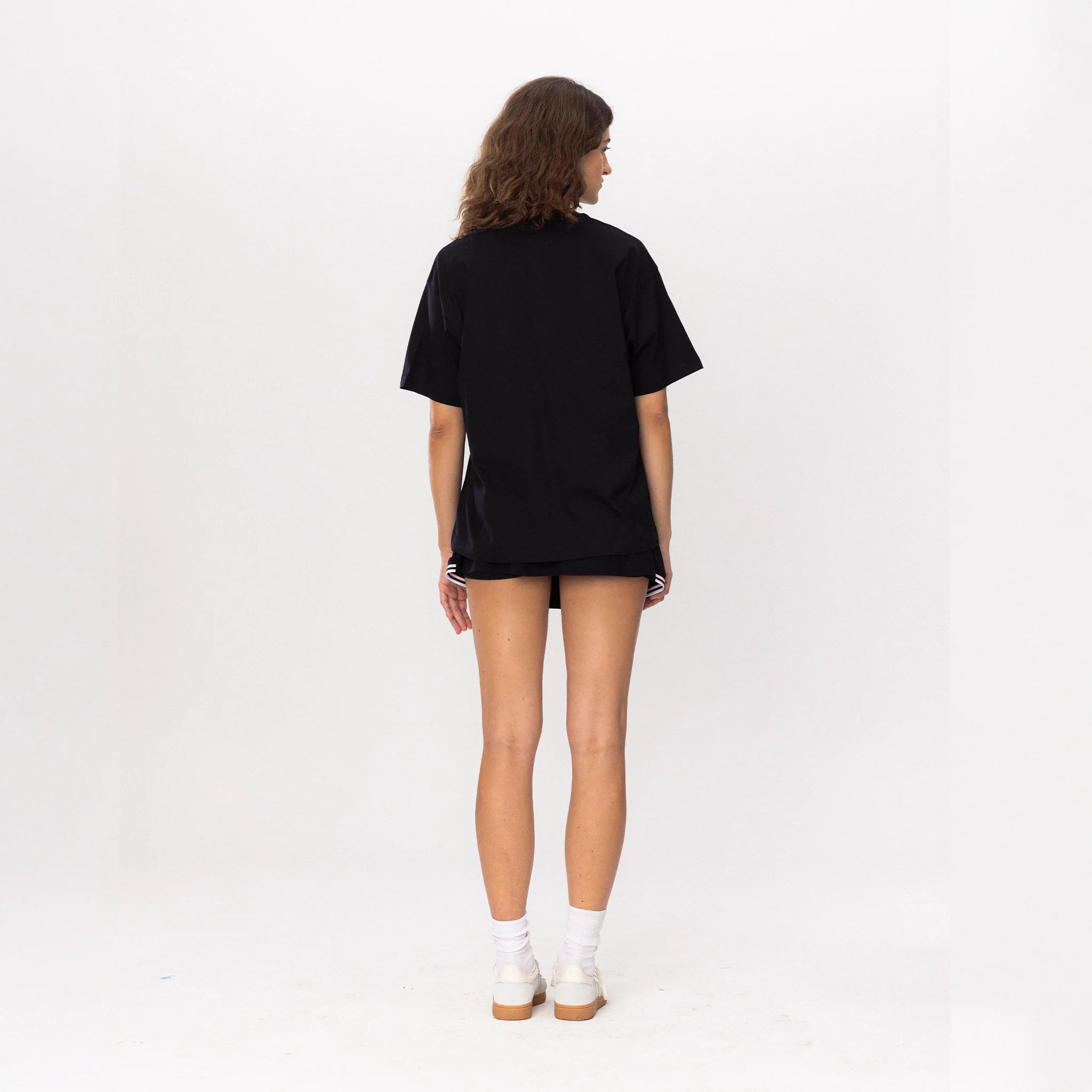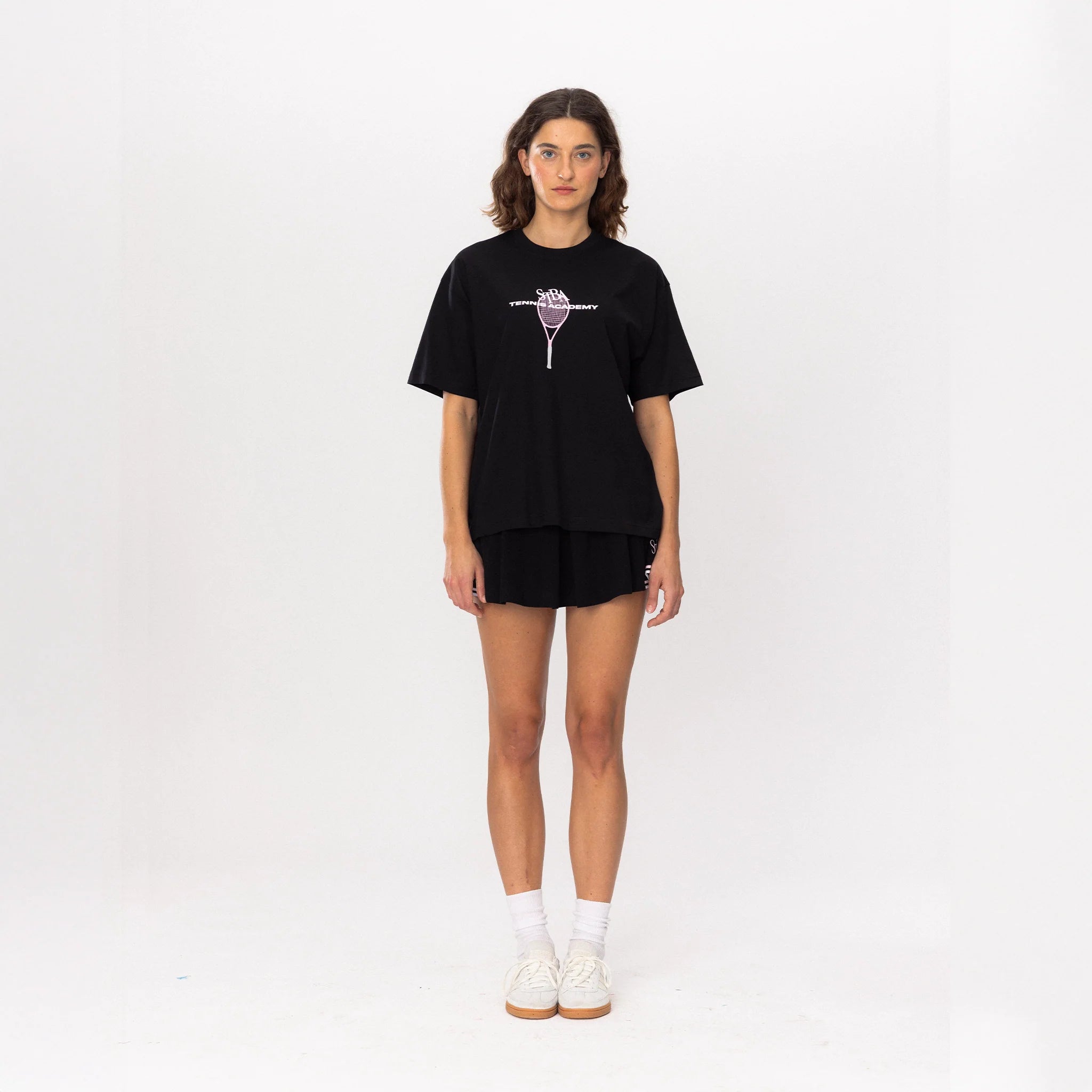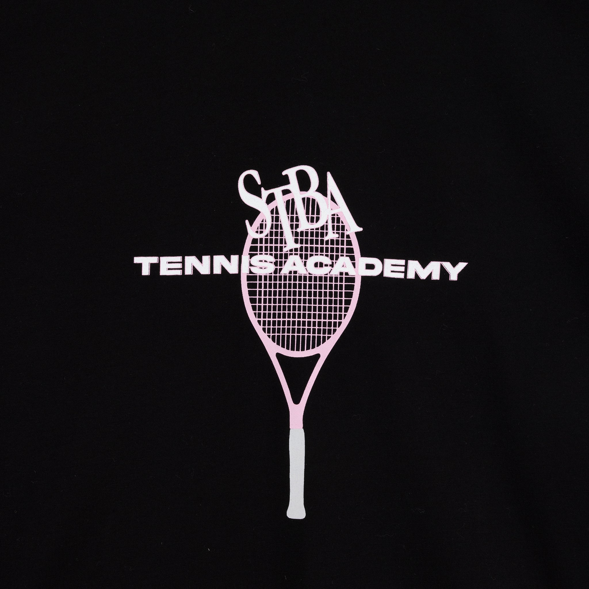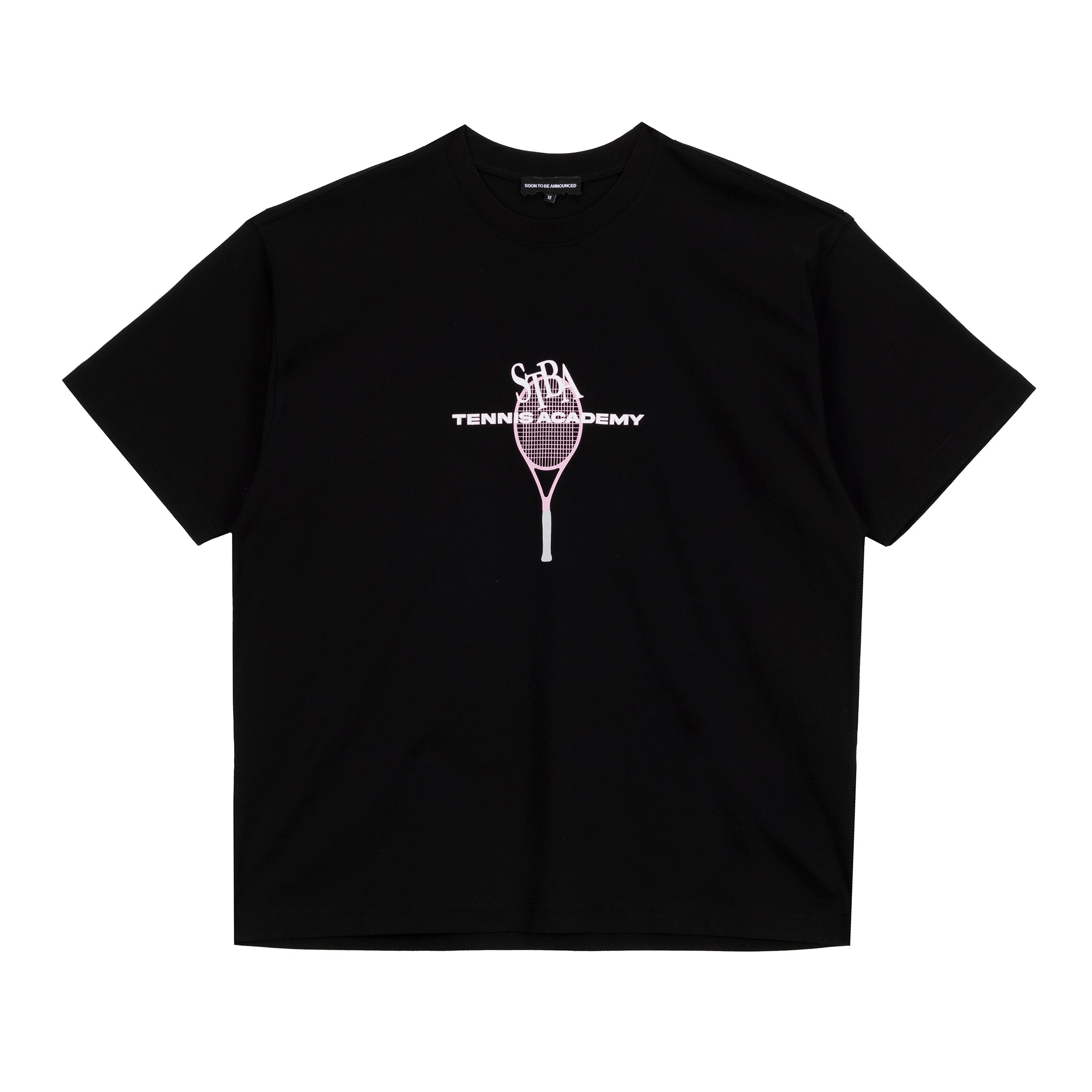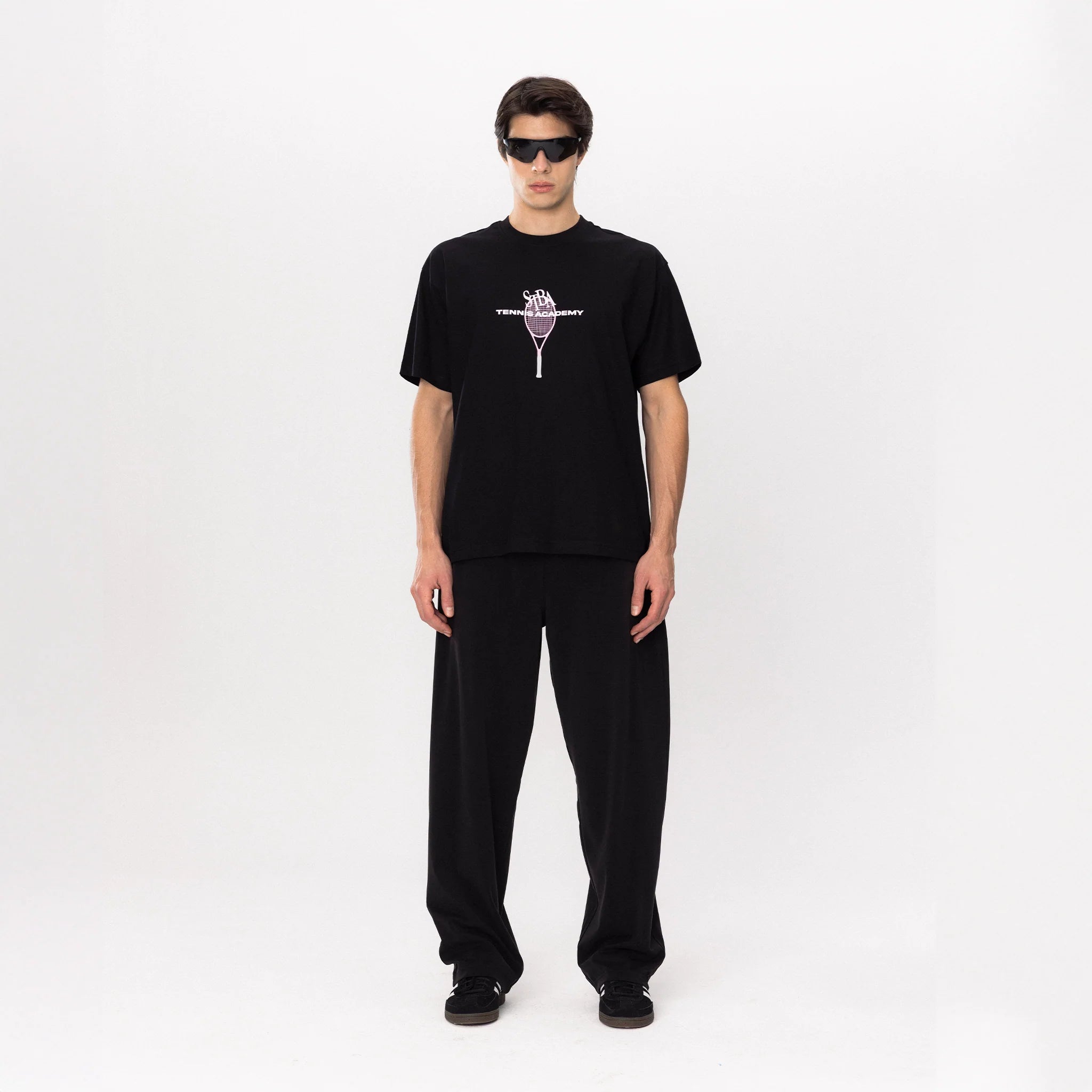 The Tennis Academy Black Tee pairs a sleek black base with a soft pink racket graphic, balancing sporty attitude with a clean streetwear silhouette.