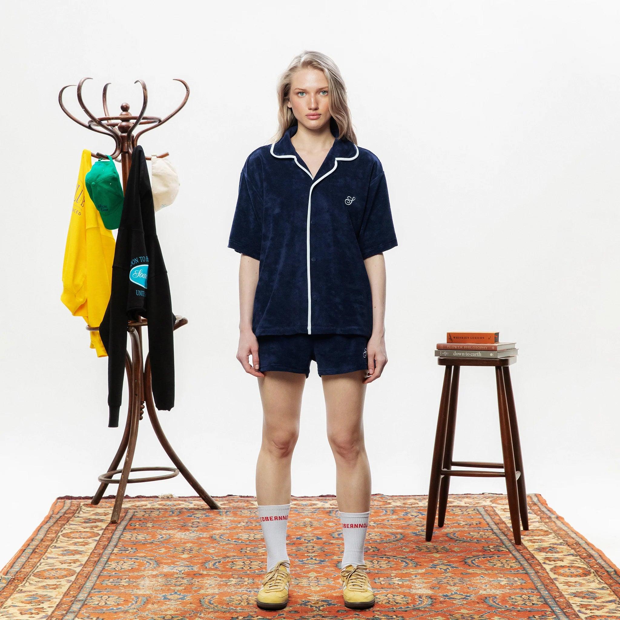 - S Logo Embroidery Terry Bowling Shirt in White and Navy.