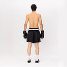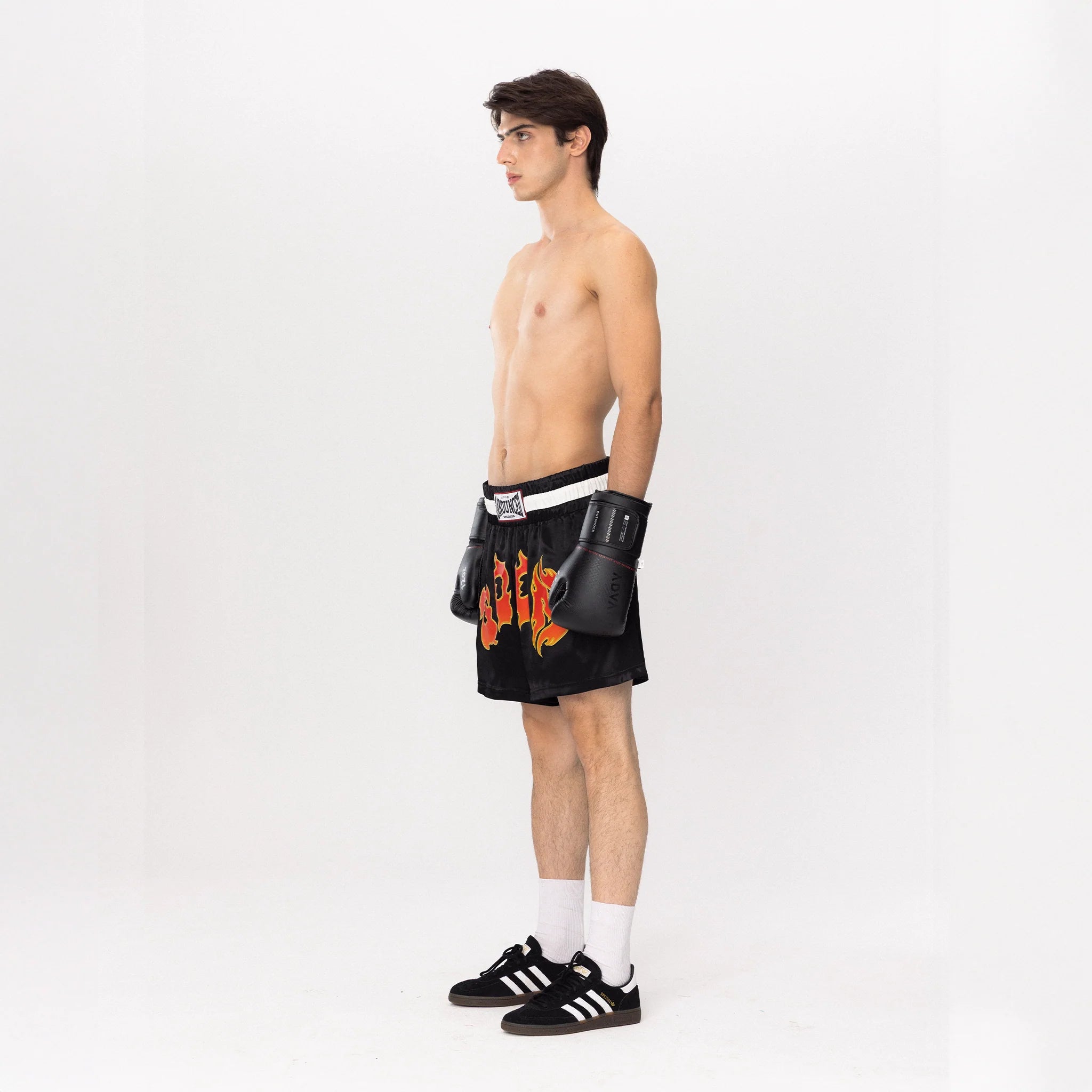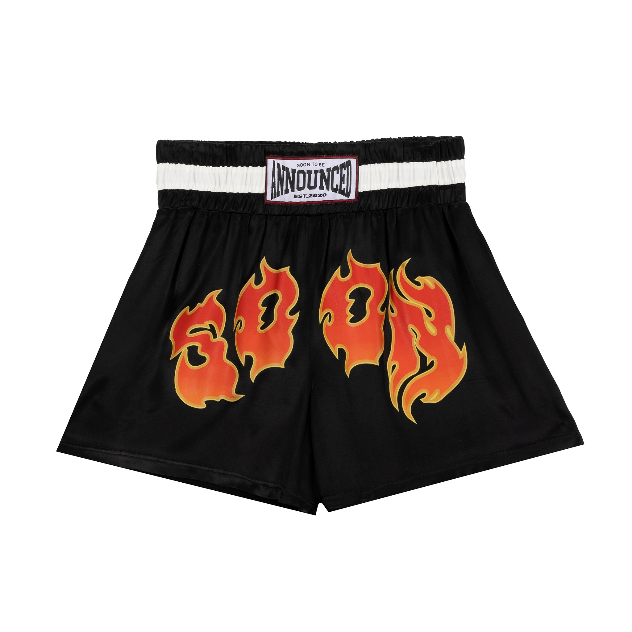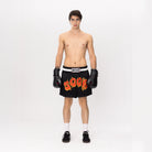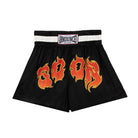 The Boxing Shorts bring the raw spirit of the ring into streetwear form with bold flame lettering blazing across the front. The black satin-style base and contrast waistband echo classic boxing silhouettes- powerful, iconic, unmistakable.