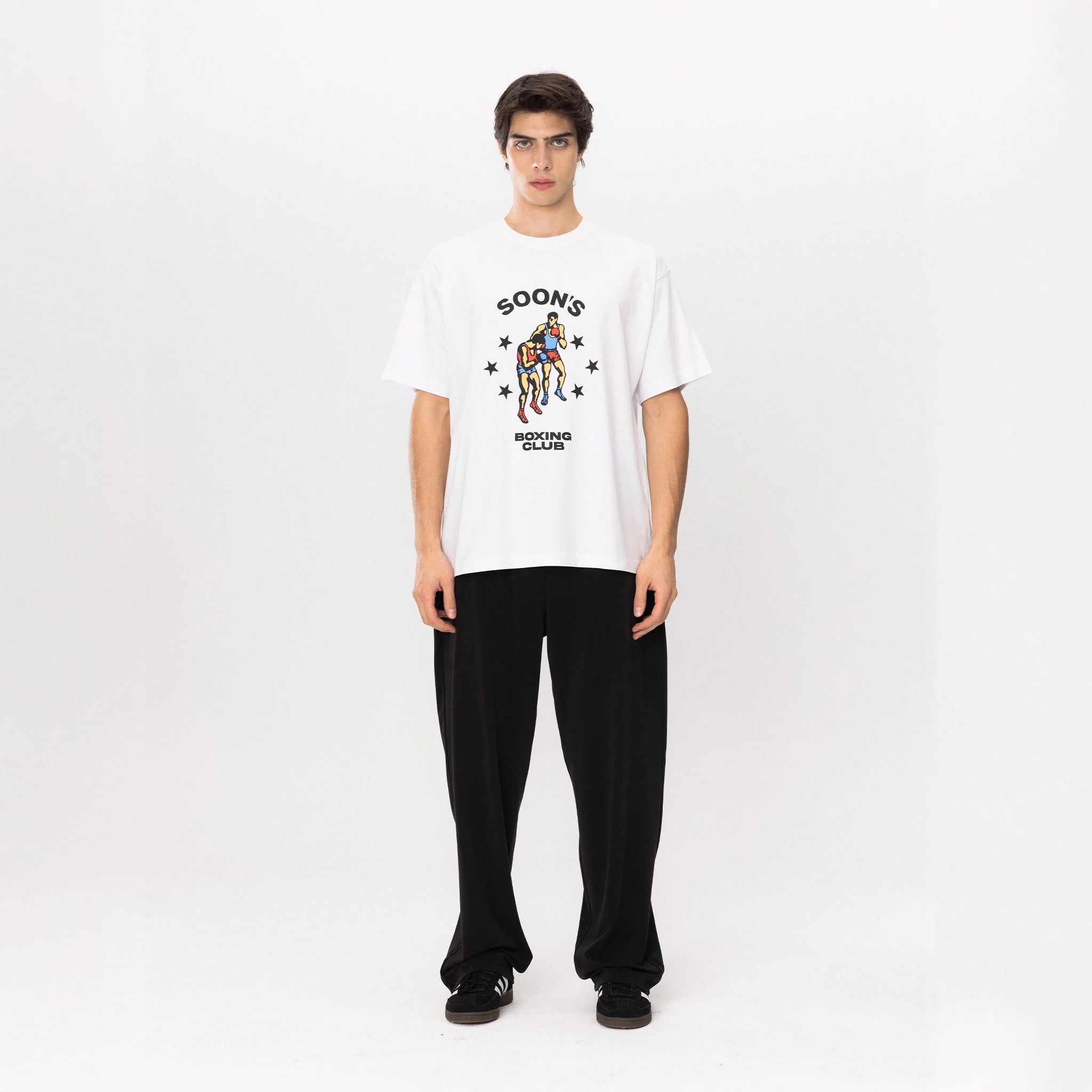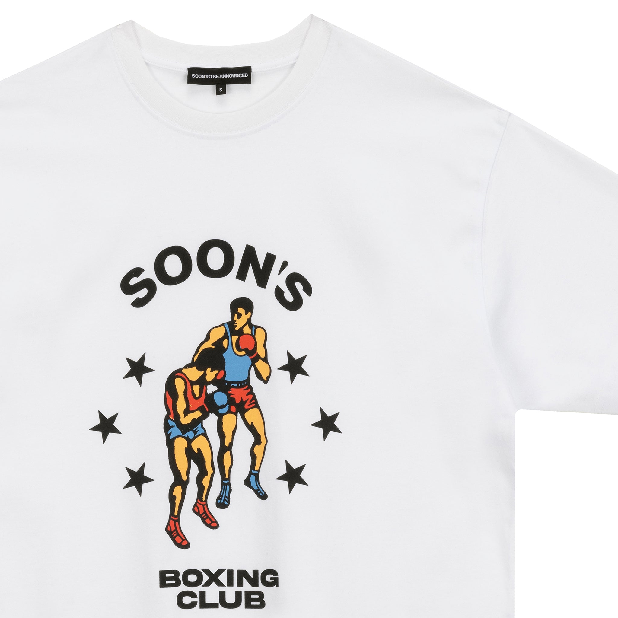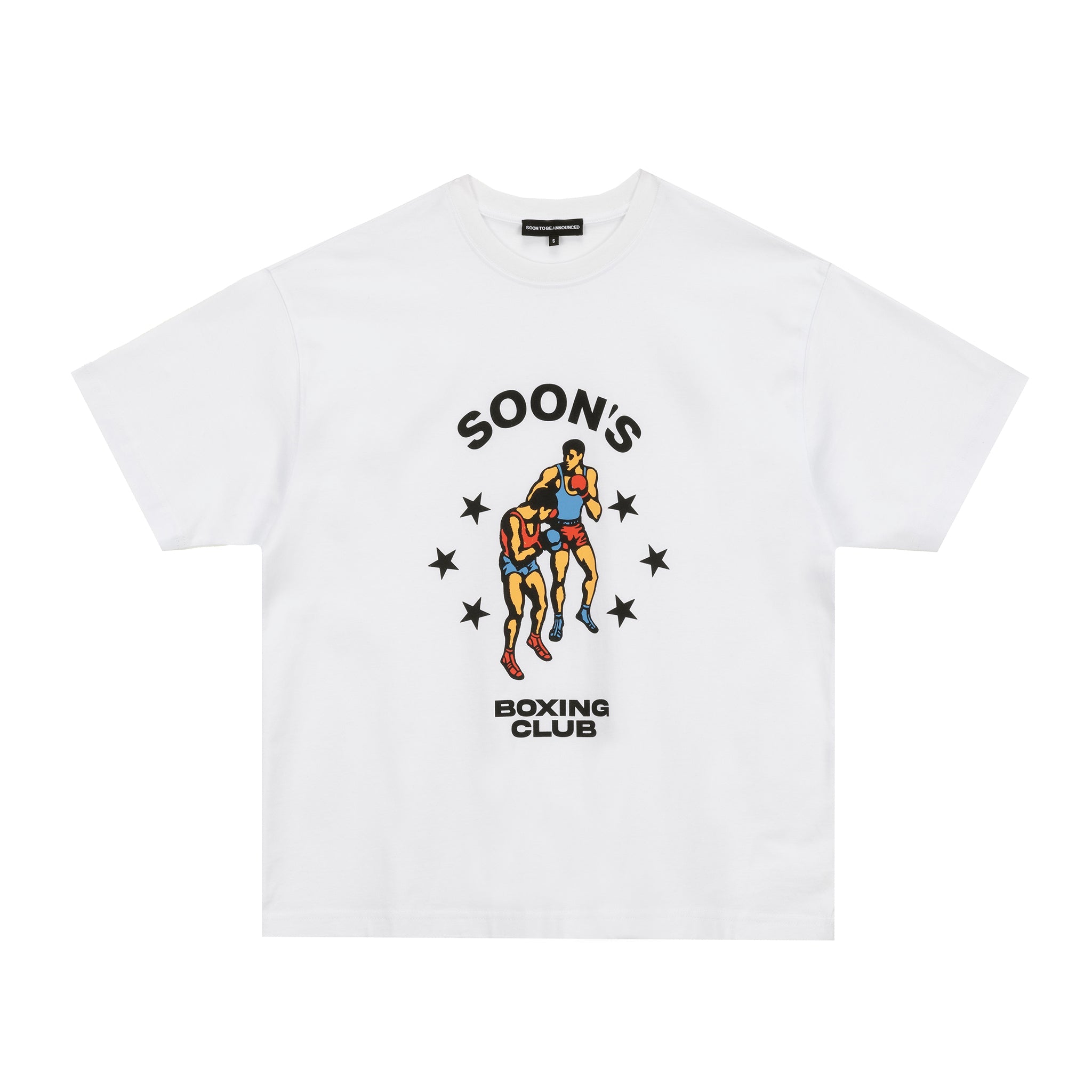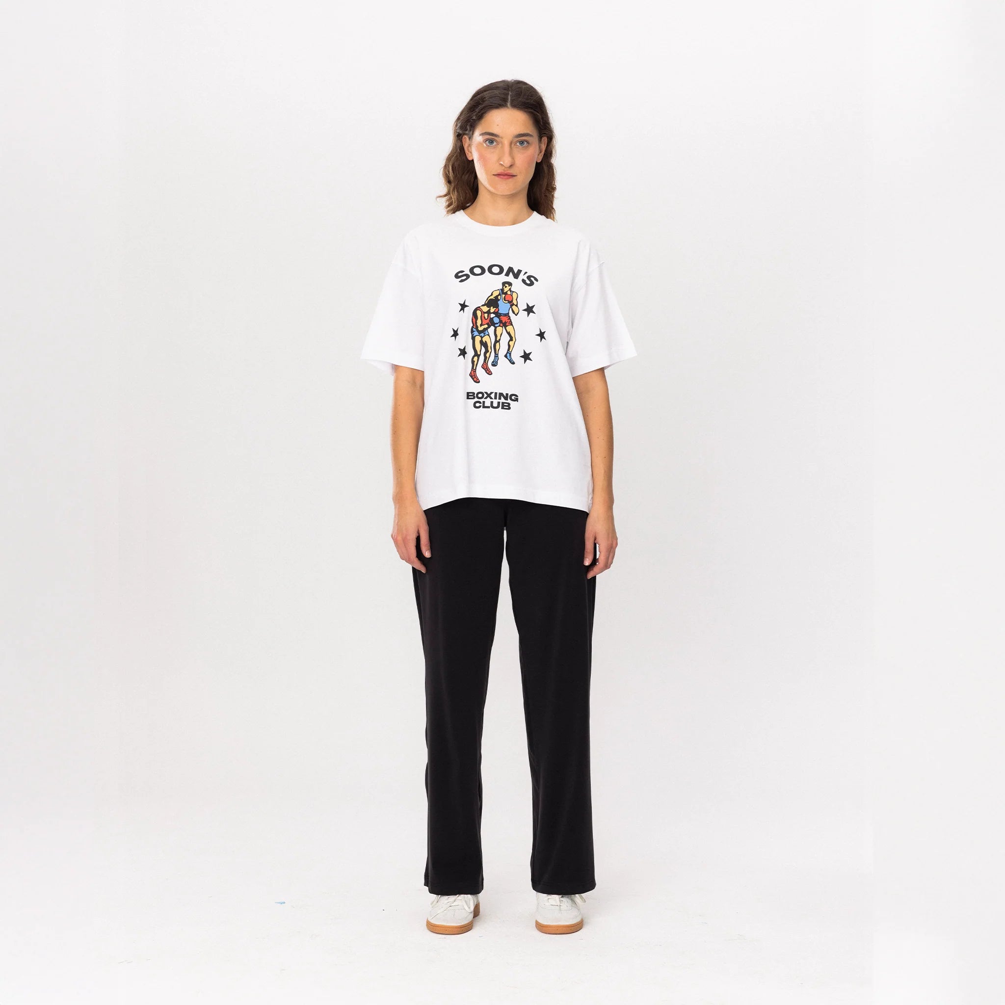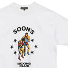 The Retro Boxing GYM Tee channels old-school boxing posters with its bold graphic of two fighters locked in motion, surrounded by star detailing and the SOON’S Boxing Club emblem.