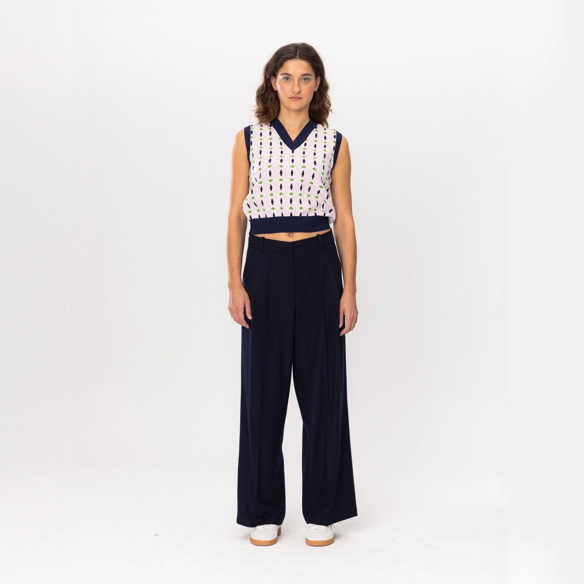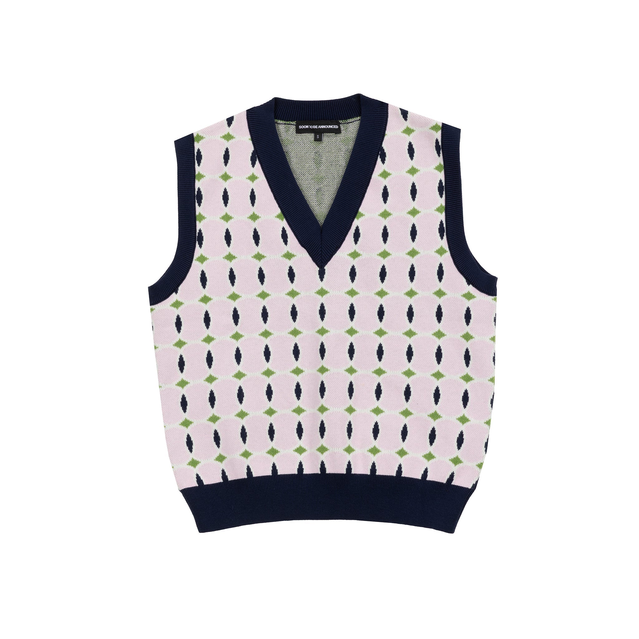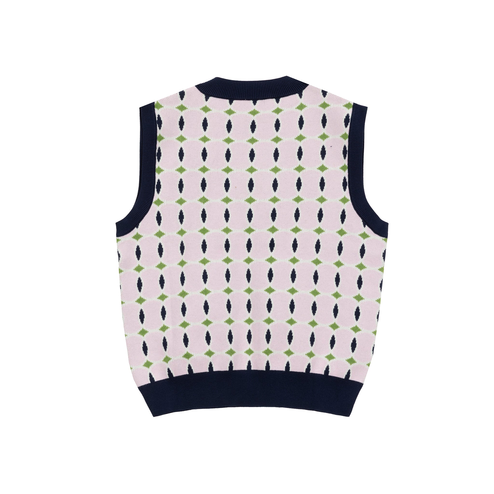 The Tennis Academy Knit Vest blends a soft pastel base with navy and green geometric detailing, creating a look that feels both classic and playfully modern.