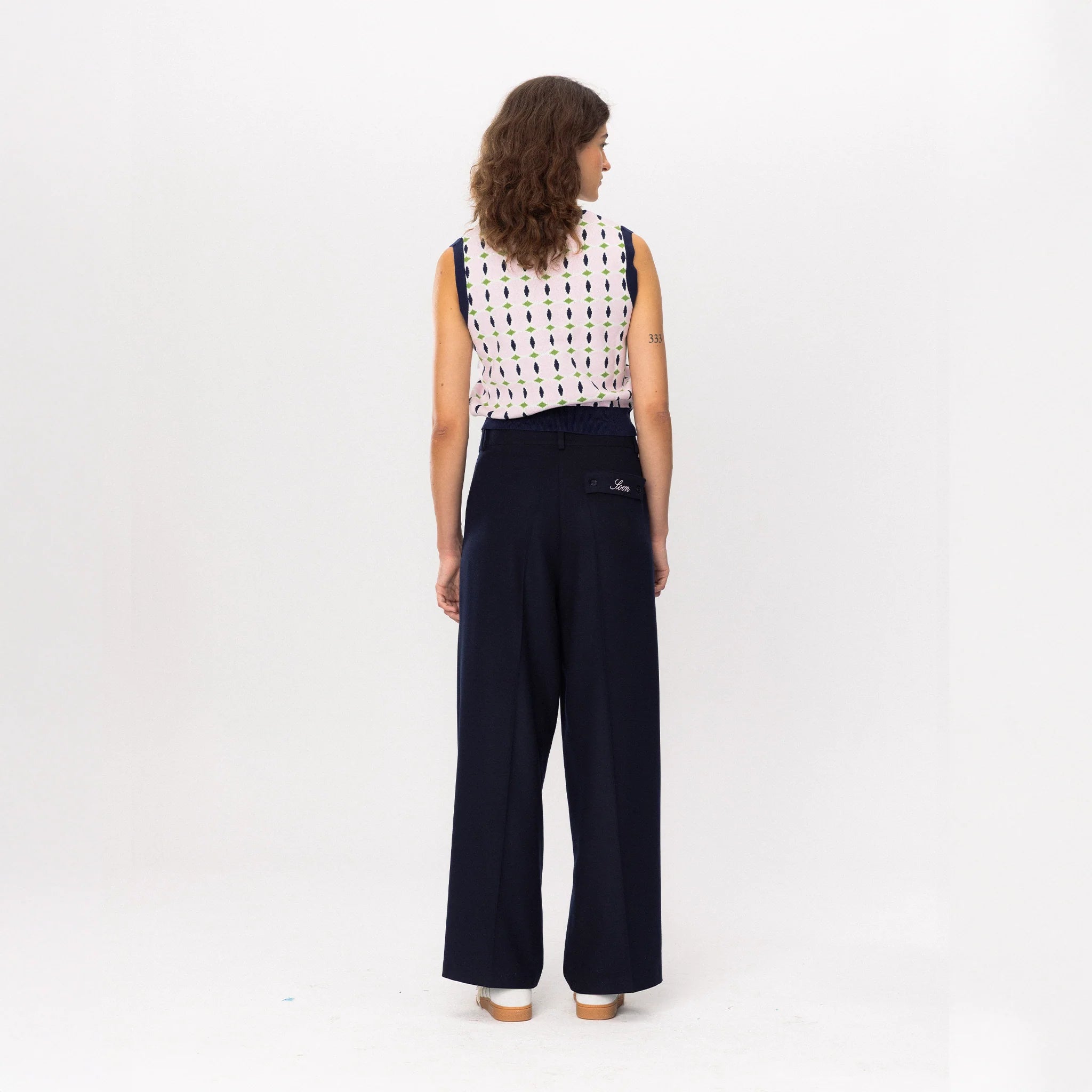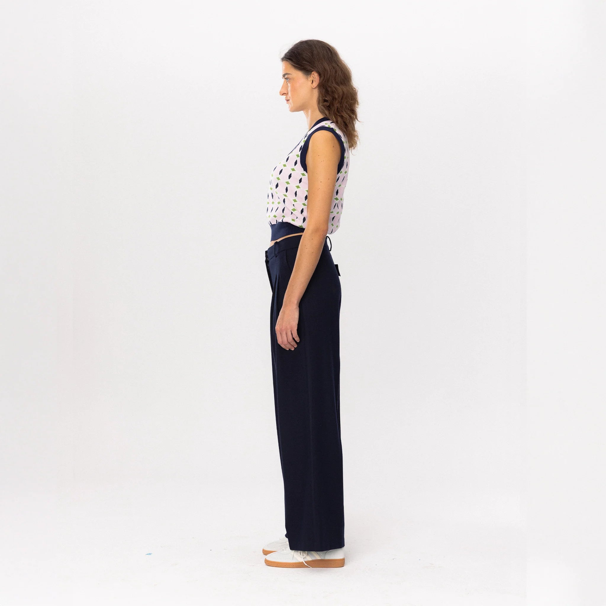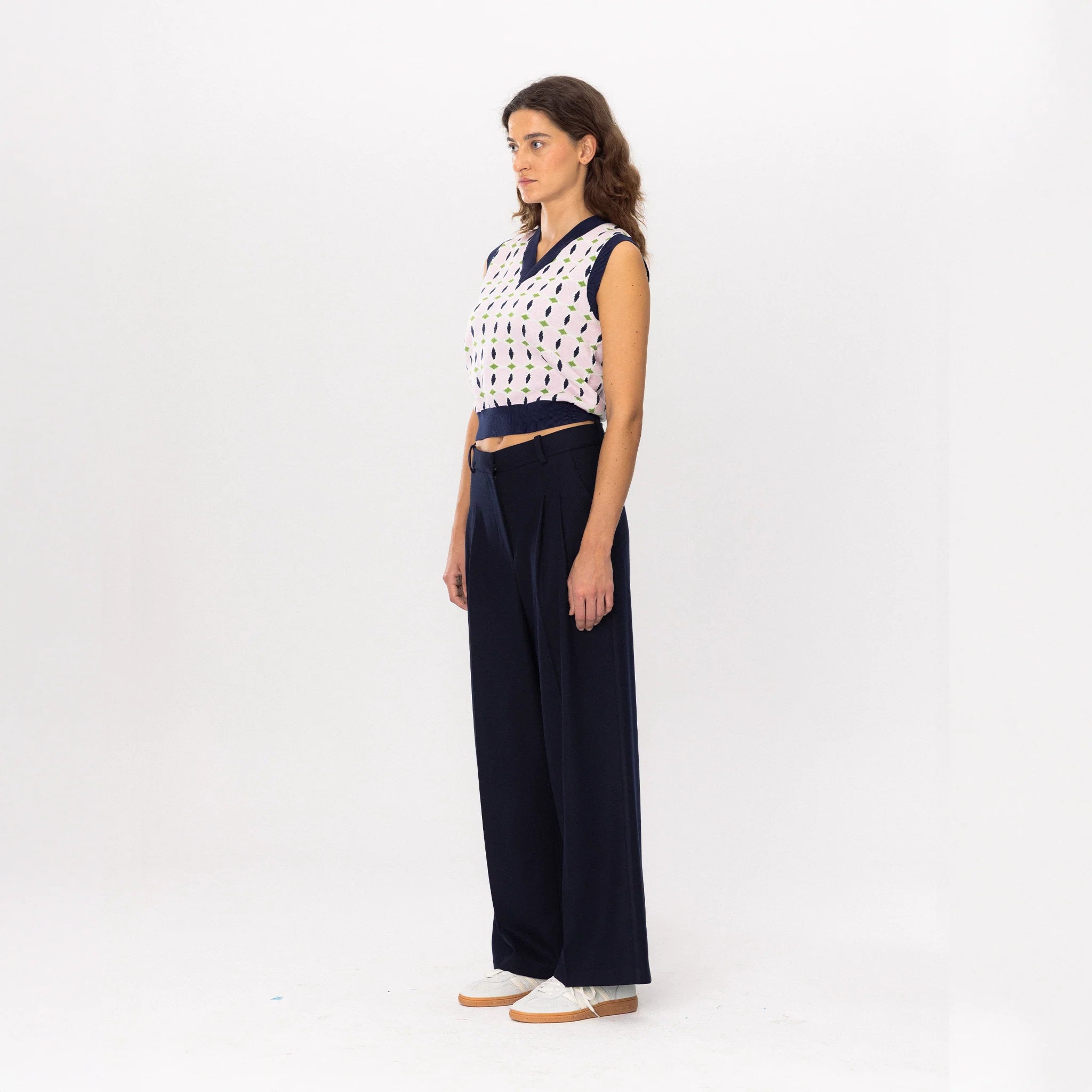 The Tennis Academy Knit Vest blends a soft pastel base with navy and green geometric detailing, creating a look that feels both classic and playfully modern.
